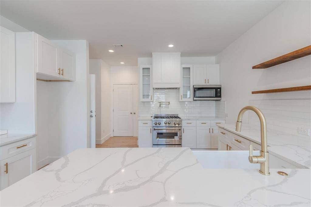 The chef's kitchen is a culinary dream, featuring high-end Z Line stainless steel appliances and gleaming white granite countertops. Bathrooms are adorned with sophisticated gold accents, a freestanding tub, and expansive closets for all your storage needs. An additional office space provides the perfect setup for work or study. Step outside through French doors onto the covered patio, seamlessly blending indoor and outdoor living—ideal for relaxing or entertaining. Situated on a generous 50x150 lot, this home is perfectly located near the Santa Fe Trail, White Rock Lake, Baylor Medical District, the Central Business District, and vibrant dining options. It's the ideal blend of modern design and convenient urban living.